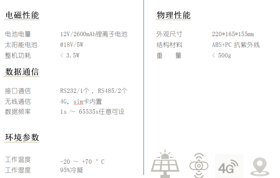 集成多传感器开发(可选传感器配置)采用微电子控制具有4G/5G公网数据传输具有RS485数据接口,可接入不同传感器数据发送频率1s ~ 65535s任意可设采用北斗/GPS位置服务及时钟校正工业外壳设计,防水防尘太阳能供电,内置锂电池延时工作
